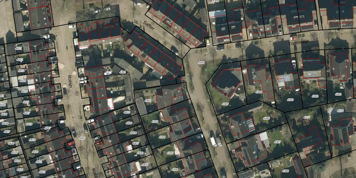 Het perceel waarop Toermalijn 16 staat heeft een oppervlakte van 359 m². Dit is een groot perceel. De perceeloppervlakte wordt geregistreerd door het Kadaster. Gedetailleerde informatie over de maten van dit perceel kunt u vinden in het rapport Kadastrale kaart met maatvoering van Toermalijn 16.