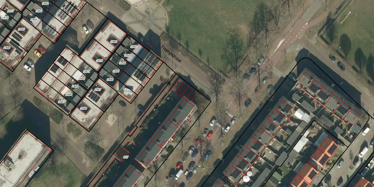 Het perceel waarop Trompstraat 97 staat heeft een oppervlakte van 2775 m². Dit is een zeer groot perceel. De perceeloppervlakte wordt geregistreerd door het Kadaster. Gedetailleerde informatie over de maten van dit perceel kunt u vinden in het rapport Kadastrale kaart met maatvoering van Trompstraat 97.