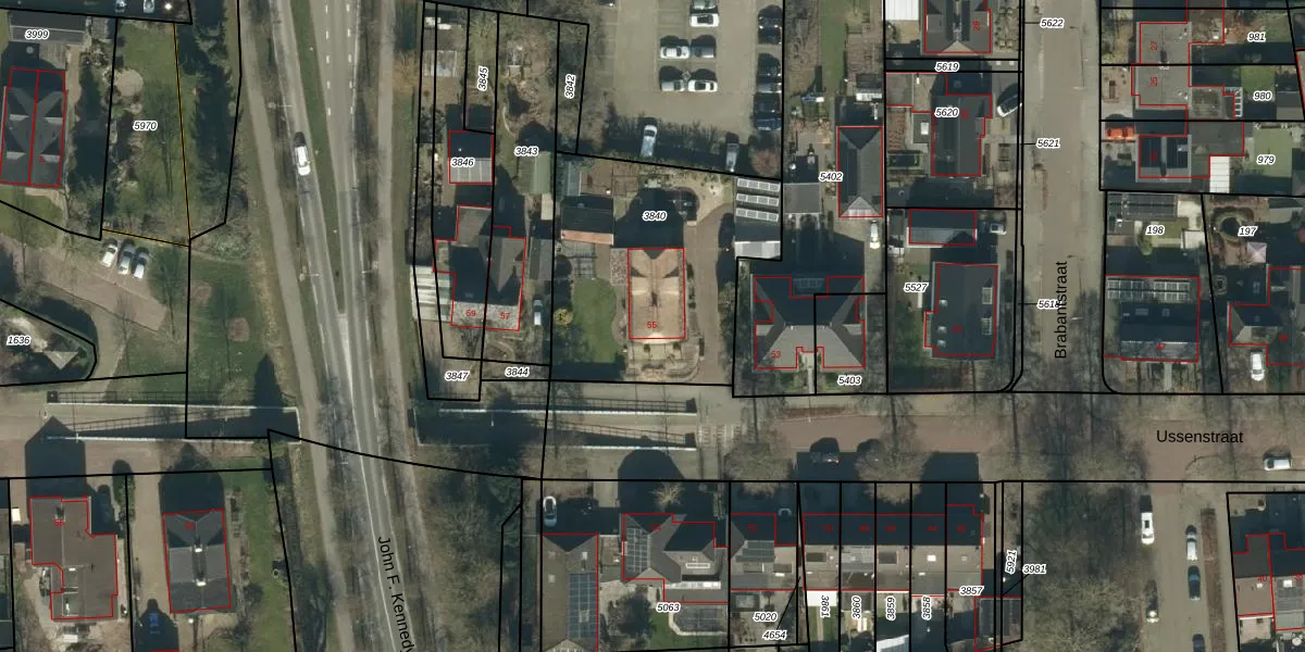 Het perceel waarop Ussenstraat 55 staat heeft een oppervlakte van 1034 m². Dit is een zeer groot perceel. De perceeloppervlakte wordt geregistreerd door het Kadaster. Gedetailleerde informatie over de maten van dit perceel kunt u vinden in het rapport Kadastrale kaart met maatvoering van Ussenstraat 55.