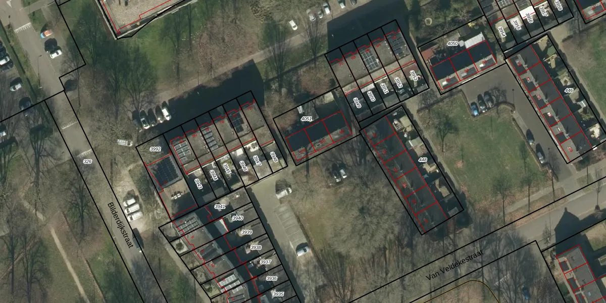 Het perceel waarop Van Veldekestraat 103 staat heeft een oppervlakte van 426 m². Dit is een groot perceel. De perceeloppervlakte wordt geregistreerd door het Kadaster. Gedetailleerde informatie over de maten van dit perceel kunt u vinden in het rapport Kadastrale kaart met maatvoering van Van Veldekestraat 103.