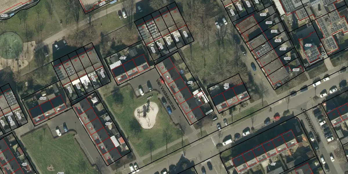 Het perceel waarop Van Veldekestraat 21 staat heeft een oppervlakte van 642 m². Dit is een groot perceel. De perceeloppervlakte wordt geregistreerd door het Kadaster. Gedetailleerde informatie over de maten van dit perceel kunt u vinden in het rapport Kadastrale kaart met maatvoering van Van Veldekestraat 21.