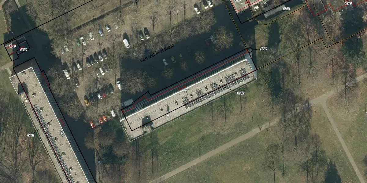 Het perceel waarop Van Veldekestraat 96 staat heeft een oppervlakte van 1000 m². Dit is een zeer groot perceel. De perceeloppervlakte wordt geregistreerd door het Kadaster. Gedetailleerde informatie over de maten van dit perceel kunt u vinden in het rapport Kadastrale kaart met maatvoering van Van Veldekestraat 96.