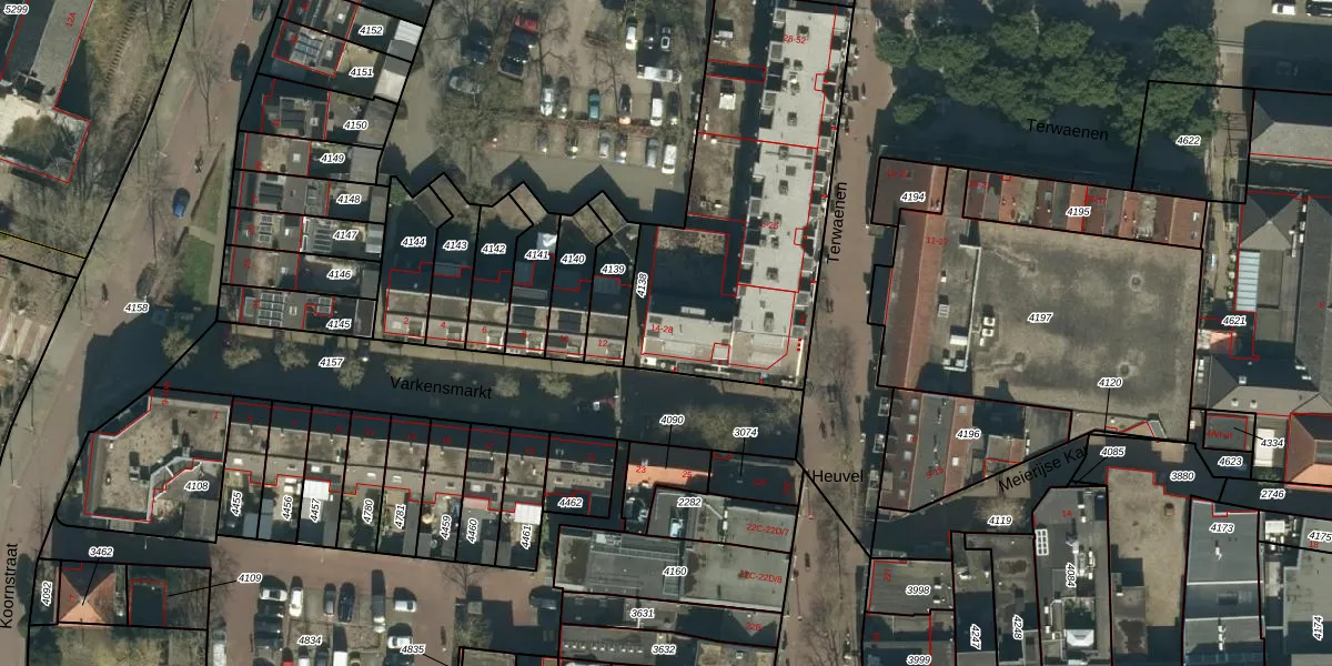 Het perceel waarop Varkensmarkt 18 staat heeft een oppervlakte van 1348 m². Dit is een zeer groot perceel. De perceeloppervlakte wordt geregistreerd door het Kadaster. Gedetailleerde informatie over de maten van dit perceel kunt u vinden in het rapport Kadastrale kaart met maatvoering van Varkensmarkt 18.