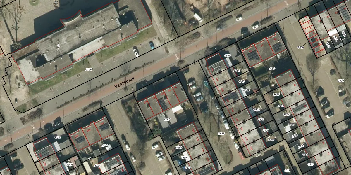 Het perceel waarop Verdistraat 96 staat heeft een oppervlakte van 971 m². Dit is een groot perceel. De perceeloppervlakte wordt geregistreerd door het Kadaster. Gedetailleerde informatie over de maten van dit perceel kunt u vinden in het rapport Kadastrale kaart met maatvoering van Verdistraat 96.