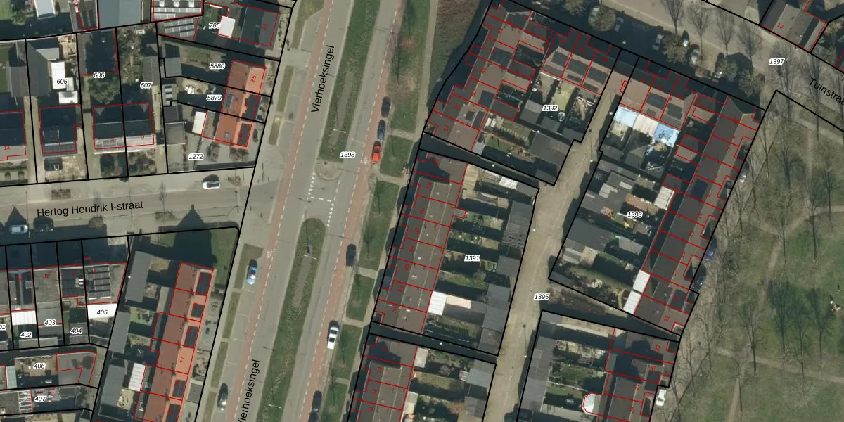 Het perceel waarop Vierhoeksingel 60 staat heeft een oppervlakte van 1287 m². Dit is een zeer groot perceel. De perceeloppervlakte wordt geregistreerd door het Kadaster. Gedetailleerde informatie over de maten van dit perceel kunt u vinden in het rapport Kadastrale kaart met maatvoering van Vierhoeksingel 60.