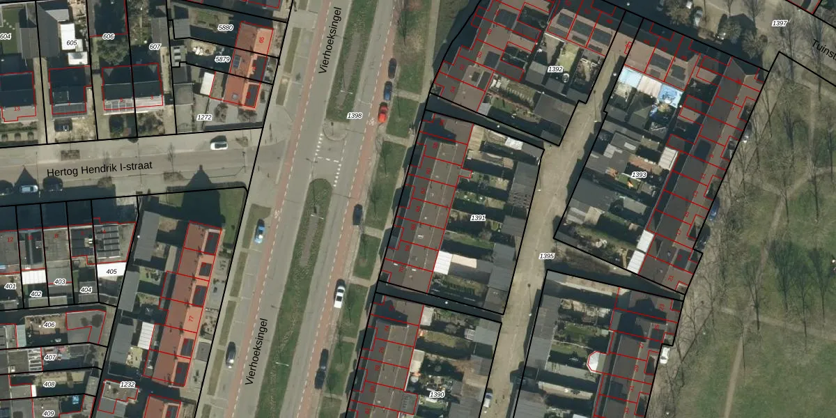 Het perceel waarop Vierhoeksingel 64 staat heeft een oppervlakte van 1287 m². Dit is een zeer groot perceel. De perceeloppervlakte wordt geregistreerd door het Kadaster. Gedetailleerde informatie over de maten van dit perceel kunt u vinden in het rapport Kadastrale kaart met maatvoering van Vierhoeksingel 64.