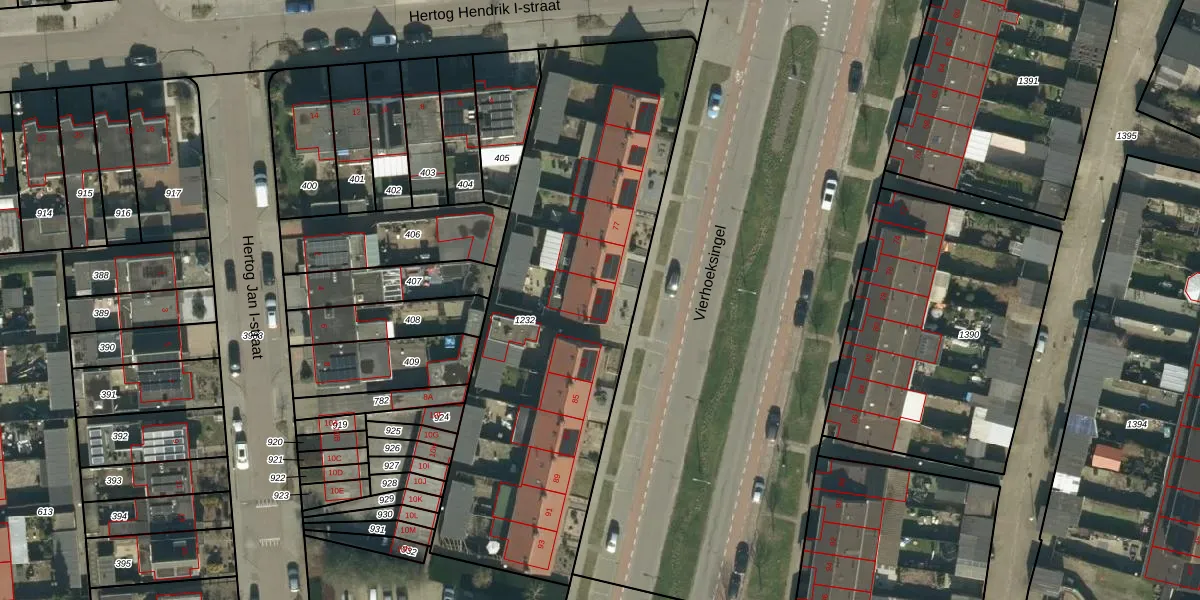 Het perceel waarop Vierhoeksingel 81 staat heeft een oppervlakte van 2182 m². Dit is een zeer groot perceel. De perceeloppervlakte wordt geregistreerd door het Kadaster. Gedetailleerde informatie over de maten van dit perceel kunt u vinden in het rapport Kadastrale kaart met maatvoering van Vierhoeksingel 81.