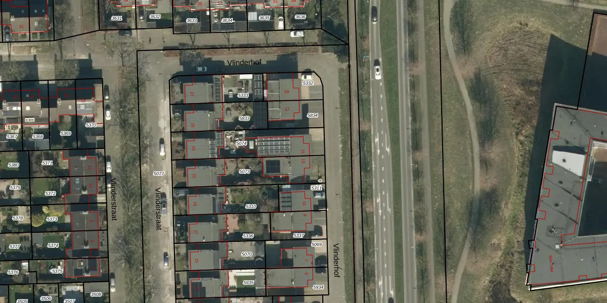 Vlinderhof 15 is gelegen op kadastraal perceel OSS00K5074. Deze kadastrale aanduiding is uniek en wordt gebruikt door het Kadaster om eigendomsrechten en andere zakelijke rechten vast te leggen. Het perceel maakt onderdeel uit van de kadastrale gemeente Oss.