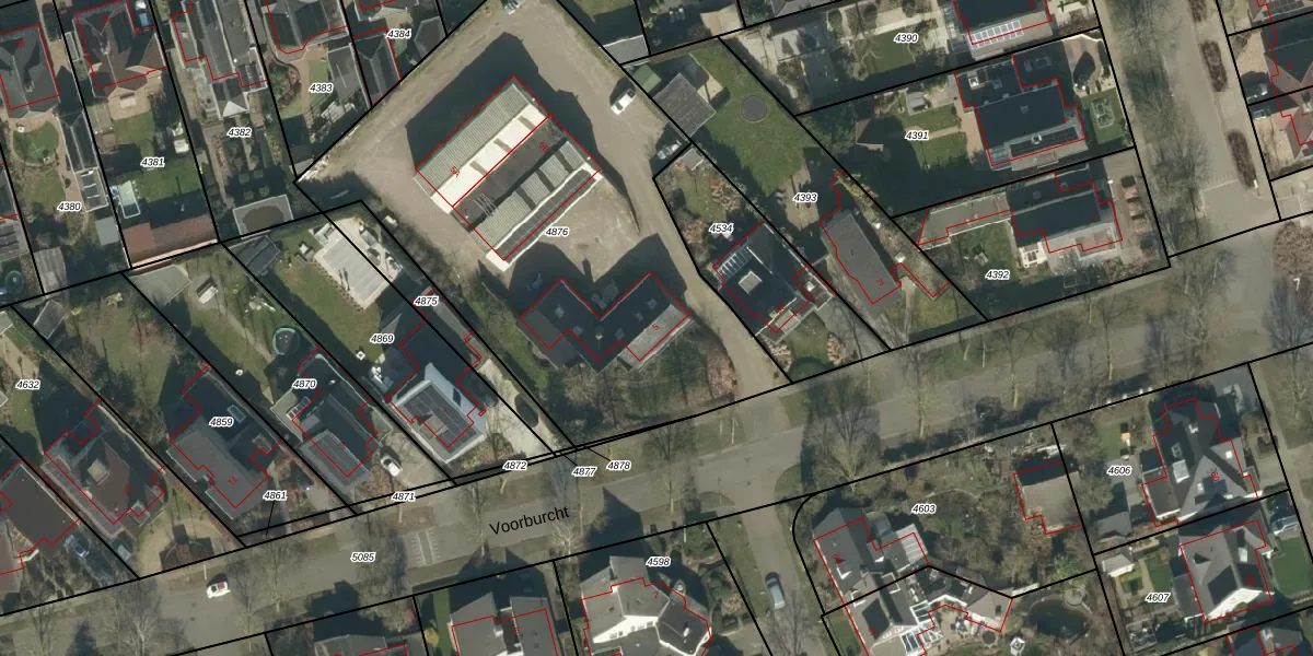 Het perceel waarop Voorburcht 5 staat heeft een oppervlakte van 2597 m². Dit is een zeer groot perceel. De perceeloppervlakte wordt geregistreerd door het Kadaster. Gedetailleerde informatie over de maten van dit perceel kunt u vinden in het rapport Kadastrale kaart met maatvoering van Voorburcht 5.