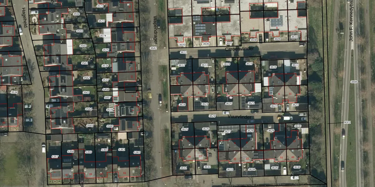 Vuurvlinder 1 is gelegen op kadastraal perceel OSS00K3618. Deze kadastrale aanduiding is uniek en wordt gebruikt door het Kadaster om eigendomsrechten en andere zakelijke rechten vast te leggen. Het perceel maakt onderdeel uit van de kadastrale gemeente Oss.