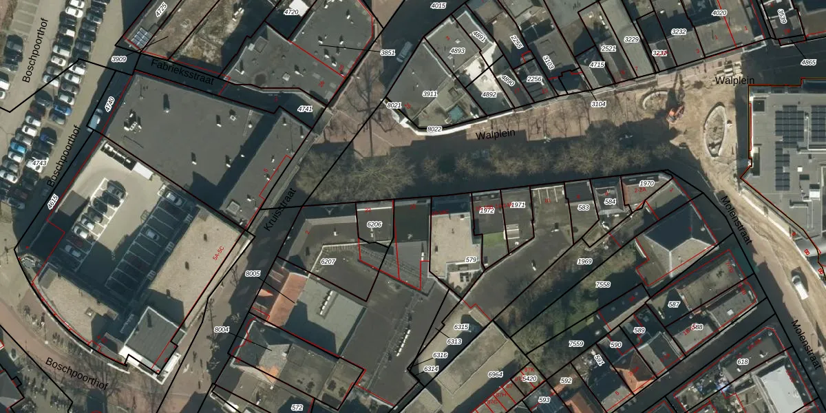 Walplein 20 is gelegen op kadastraal perceel OSS00E8005. Deze kadastrale aanduiding is uniek en wordt gebruikt door het Kadaster om eigendomsrechten en andere zakelijke rechten vast te leggen. Het perceel maakt onderdeel uit van de kadastrale gemeente Oss.