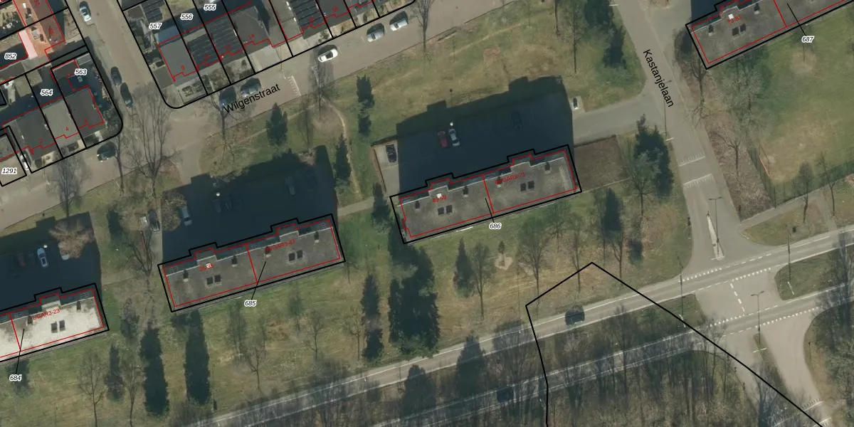 Wilgenstraat 51 is gelegen op kadastraal perceel OSS00F686. Deze kadastrale aanduiding is uniek en wordt gebruikt door het Kadaster om eigendomsrechten en andere zakelijke rechten vast te leggen. Het perceel maakt onderdeel uit van de kadastrale gemeente Oss.