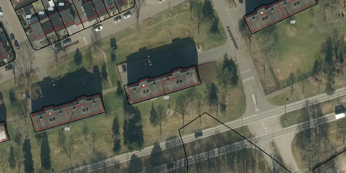 Het perceel waarop Wilgenstraat 65 staat heeft een oppervlakte van 512 m². Dit is een groot perceel. De perceeloppervlakte wordt geregistreerd door het Kadaster. Gedetailleerde informatie over de maten van dit perceel kunt u vinden in het rapport Kadastrale kaart met maatvoering van Wilgenstraat 65.