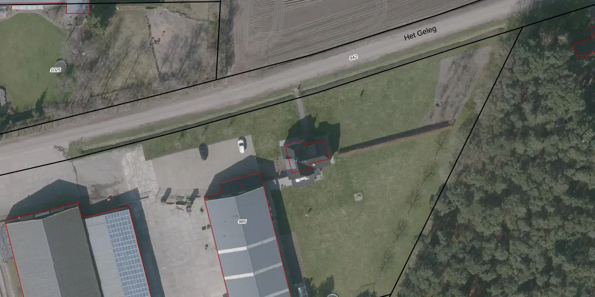 Het perceel waarop Het Geleg 1 staat heeft een oppervlakte van 1,2 ha. Dit is een zeer groot perceel. De perceeloppervlakte wordt geregistreerd door het Kadaster. Gedetailleerde informatie over de maten van dit perceel kunt u vinden in het rapport Kadastrale kaart met maatvoering van Het Geleg 1.