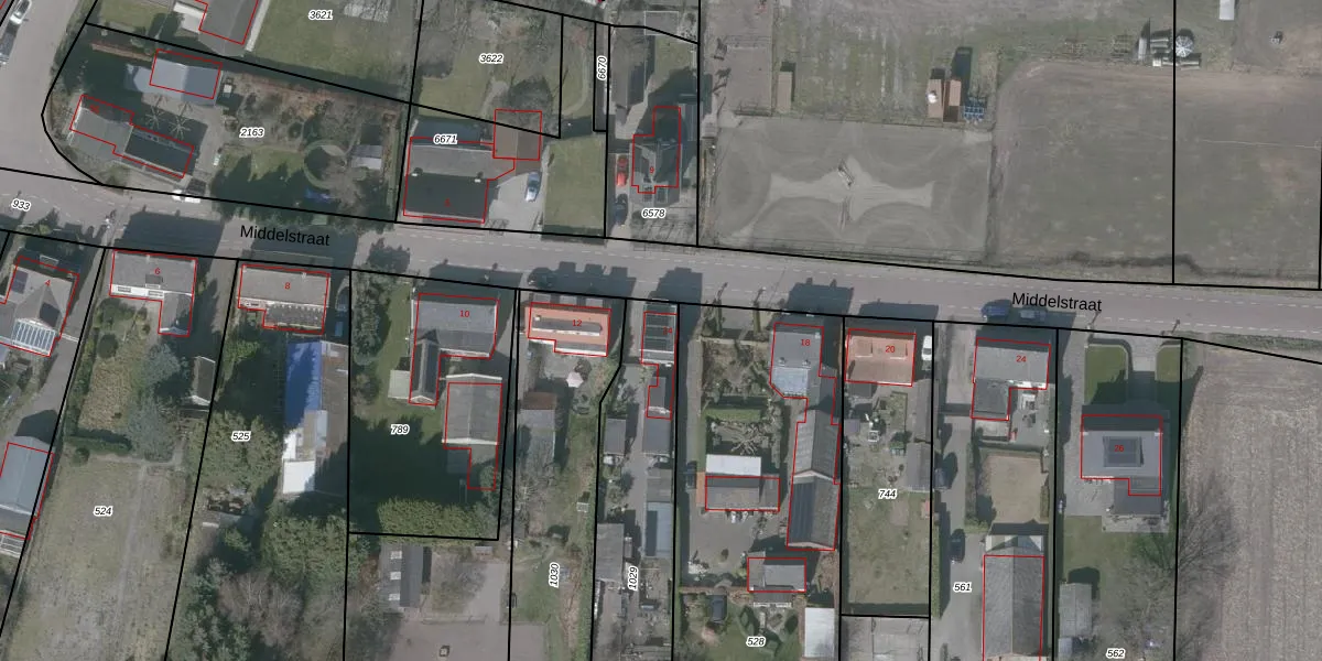 Middelstraat 14 is gelegen op kadastraal perceel OSD00E1029. Deze kadastrale aanduiding is uniek en wordt gebruikt door het Kadaster om eigendomsrechten en andere zakelijke rechten vast te leggen. Het perceel maakt onderdeel uit van de kadastrale gemeente Ossendrecht.