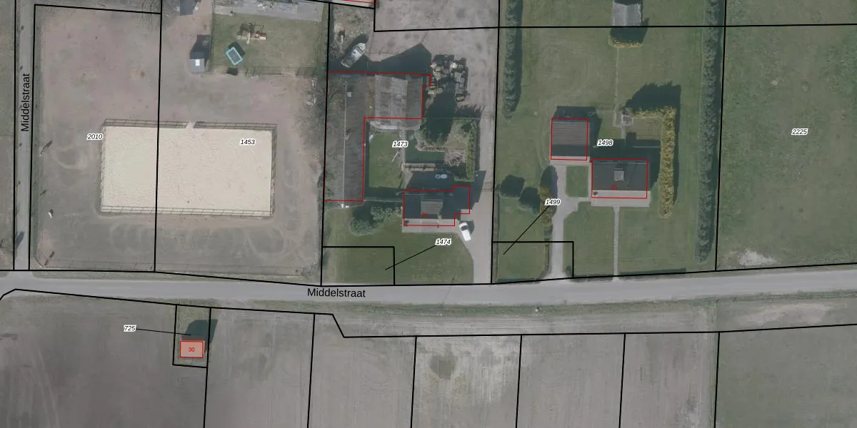 Het perceel waarop Middelstraat 31 staat heeft een oppervlakte van 2280 m². Dit is een zeer groot perceel. De perceeloppervlakte wordt geregistreerd door het Kadaster. Gedetailleerde informatie over de maten van dit perceel kunt u vinden in het rapport Kadastrale kaart met maatvoering van Middelstraat 31.