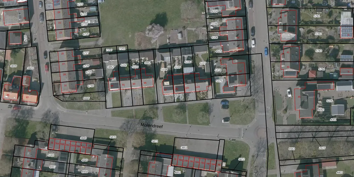 Molendreef 99 is gelegen op kadastraal perceel OSD00D5105. Deze kadastrale aanduiding is uniek en wordt gebruikt door het Kadaster om eigendomsrechten en andere zakelijke rechten vast te leggen. Het perceel maakt onderdeel uit van de kadastrale gemeente Ossendrecht.