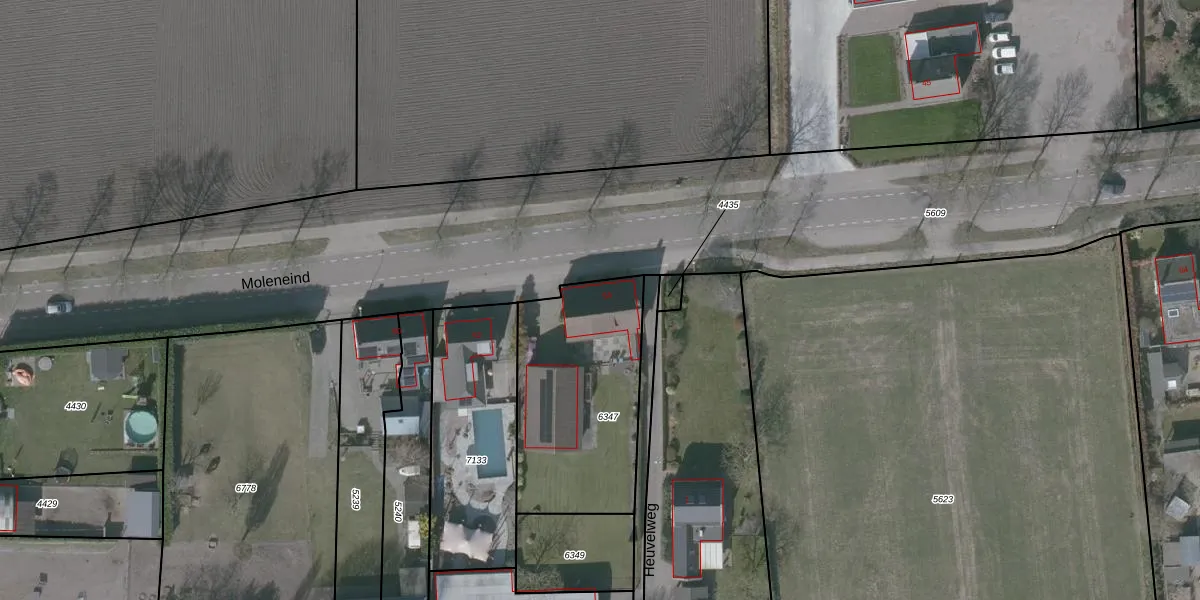 Het perceel waarop Moleneind 54 staat heeft een oppervlakte van 781 m². Dit is een groot perceel. De perceeloppervlakte wordt geregistreerd door het Kadaster. Gedetailleerde informatie over de maten van dit perceel kunt u vinden in het rapport Kadastrale kaart met maatvoering van Moleneind 54.
