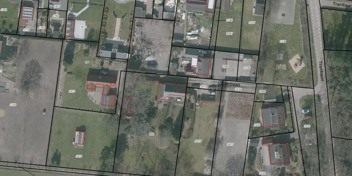 Het perceel waarop Trambaan 39 staat heeft een oppervlakte van 2190 m². Dit is een zeer groot perceel. De perceeloppervlakte wordt geregistreerd door het Kadaster. Gedetailleerde informatie over de maten van dit perceel kunt u vinden in het rapport Kadastrale kaart met maatvoering van Trambaan 39.