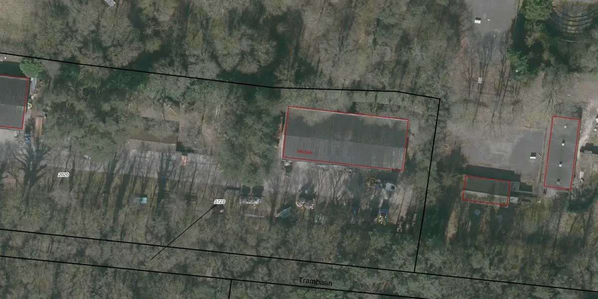 Het perceel waarop Trambaan 54-h staat heeft een oppervlakte van 1,6 ha. Dit is een zeer groot perceel. De perceeloppervlakte wordt geregistreerd door het Kadaster. Gedetailleerde informatie over de maten van dit perceel kunt u vinden in het rapport Kadastrale kaart met maatvoering van Trambaan 54-h.