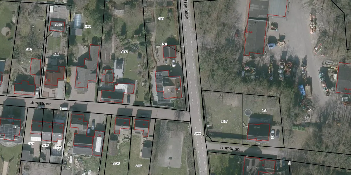 Het perceel waarop Trambaan 55 staat heeft een oppervlakte van 1360 m². Dit is een zeer groot perceel. De perceeloppervlakte wordt geregistreerd door het Kadaster. Gedetailleerde informatie over de maten van dit perceel kunt u vinden in het rapport Kadastrale kaart met maatvoering van Trambaan 55.
