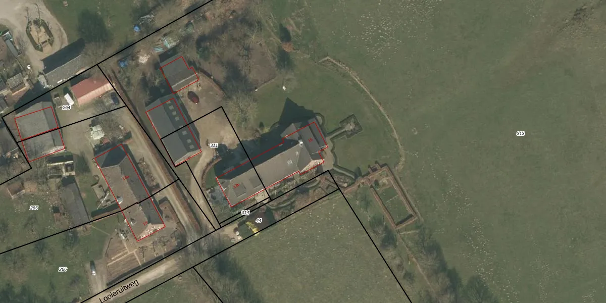 Het perceel waarop Looiseweg 15 staat heeft een oppervlakte van 2,8 ha. Dit is een zeer groot perceel. De perceeloppervlakte wordt geregistreerd door het Kadaster. Gedetailleerde informatie over de maten van dit perceel kunt u vinden in het rapport Kadastrale kaart met maatvoering van Looiseweg 15.