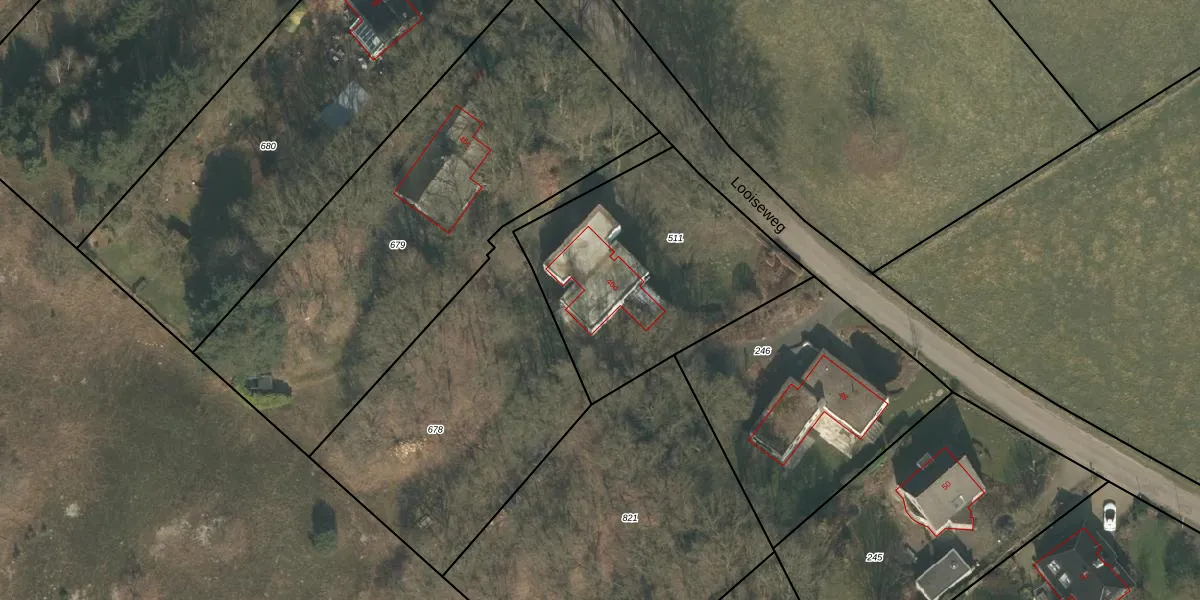 Het perceel waarop Looiseweg 46-d staat heeft een oppervlakte van 1200 m². Dit is een zeer groot perceel. De perceeloppervlakte wordt geregistreerd door het Kadaster. Gedetailleerde informatie over de maten van dit perceel kunt u vinden in het rapport Kadastrale kaart met maatvoering van Looiseweg 46-d.