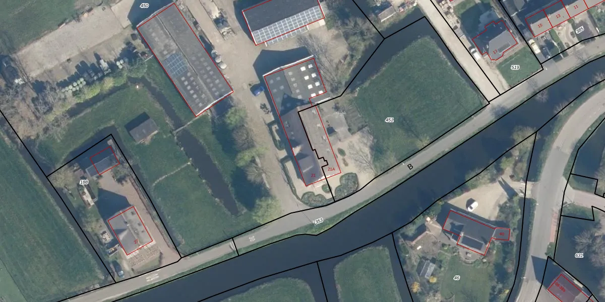 Het perceel waarop B 21 staat heeft een oppervlakte van 1,2 ha. Dit is een zeer groot perceel. De perceeloppervlakte wordt geregistreerd door het Kadaster. Gedetailleerde informatie over de maten van dit perceel kunt u vinden in het rapport Kadastrale kaart met maatvoering van B 21.