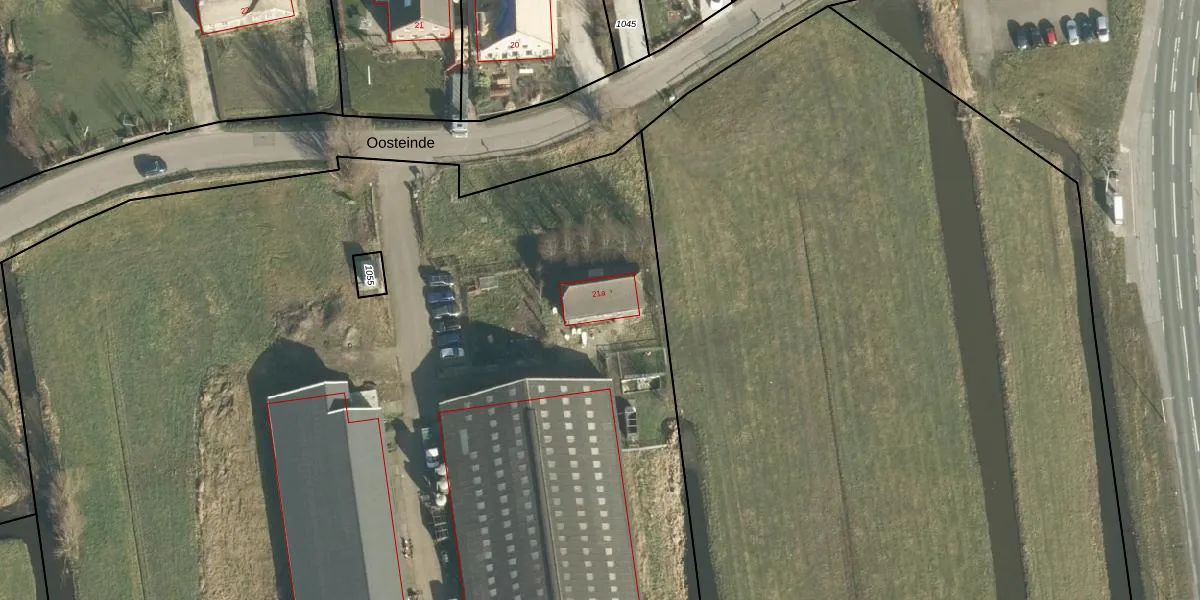 Het perceel waarop Oosteinde 21-a staat heeft een oppervlakte van 7,5 ha. Dit is een zeer groot perceel. De perceeloppervlakte wordt geregistreerd door het Kadaster. Gedetailleerde informatie over de maten van dit perceel kunt u vinden in het rapport Kadastrale kaart met maatvoering van Oosteinde 21-a.