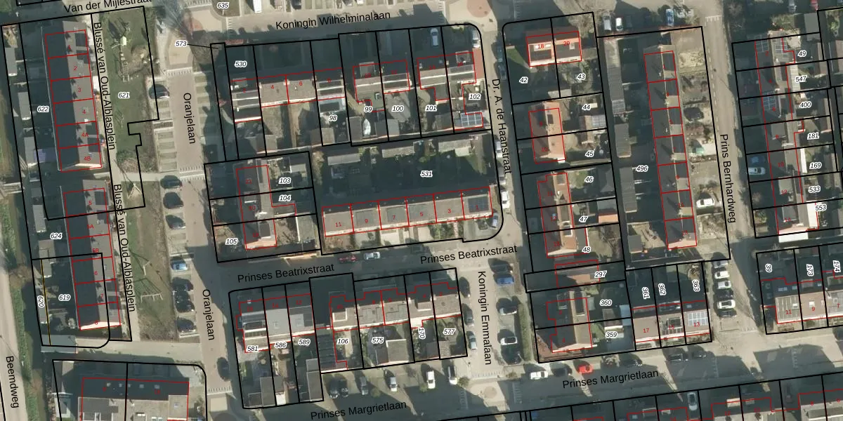 Prinses Beatrixstraat 5 is gelegen op kadastraal perceel ABS02C531. Deze kadastrale aanduiding is uniek en wordt gebruikt door het Kadaster om eigendomsrechten en andere zakelijke rechten vast te leggen. Het perceel maakt onderdeel uit van de kadastrale gemeente Oud-Alblas.