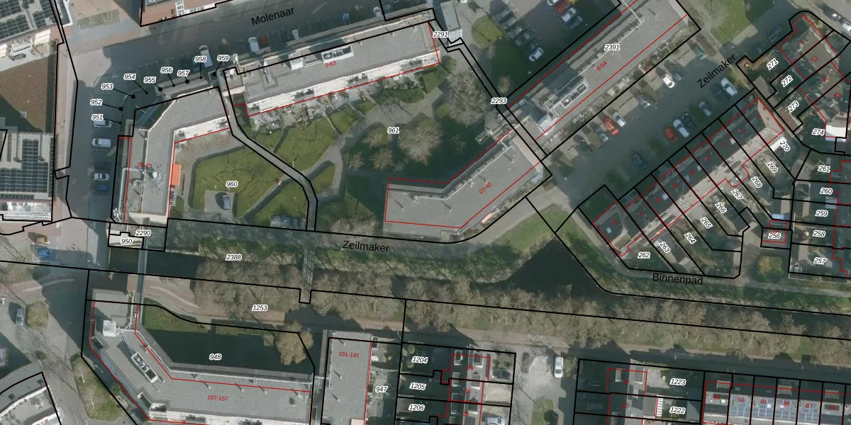 Het perceel waarop Zeilmaker 34 staat heeft een oppervlakte van 2502 m². Dit is een zeer groot perceel. De perceeloppervlakte wordt geregistreerd door het Kadaster. Gedetailleerde informatie over de maten van dit perceel kunt u vinden in het rapport Kadastrale kaart met maatvoering van Zeilmaker 34.