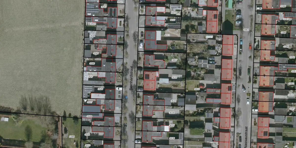 Het perceel waarop Bernhardstraat 14 staat heeft een oppervlakte van 533 m². Dit is een groot perceel. De perceeloppervlakte wordt geregistreerd door het Kadaster. Gedetailleerde informatie over de maten van dit perceel kunt u vinden in het rapport Kadastrale kaart met maatvoering van Bernhardstraat 14.