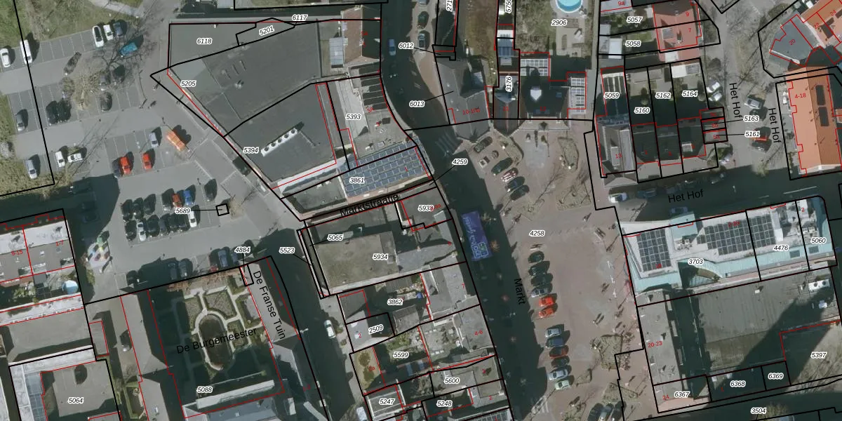 Het perceel waarop Markt 9-a staat heeft een oppervlakte van 90 m². Dit is een klein perceel. De perceeloppervlakte wordt geregistreerd door het Kadaster. Gedetailleerde informatie over de maten van dit perceel kunt u vinden in het rapport Kadastrale kaart met maatvoering van Markt 9-a.