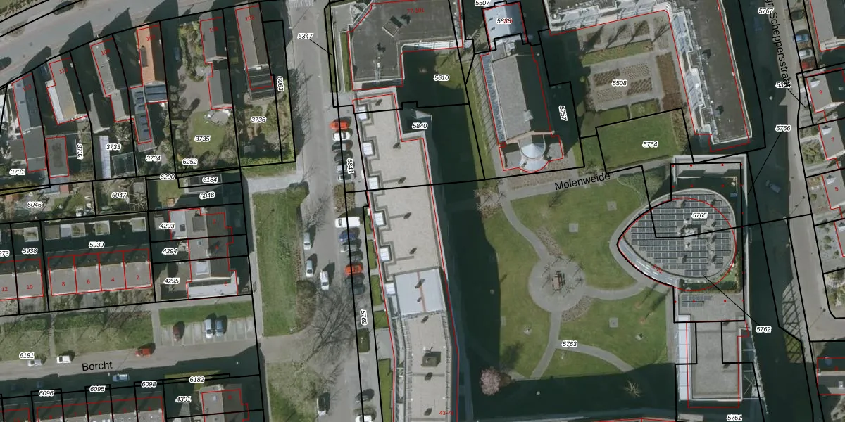 Het perceel waarop Molenweide 43 staat heeft een oppervlakte van 6590 m². Dit is een zeer groot perceel. De perceeloppervlakte wordt geregistreerd door het Kadaster. Gedetailleerde informatie over de maten van dit perceel kunt u vinden in het rapport Kadastrale kaart met maatvoering van Molenweide 43.