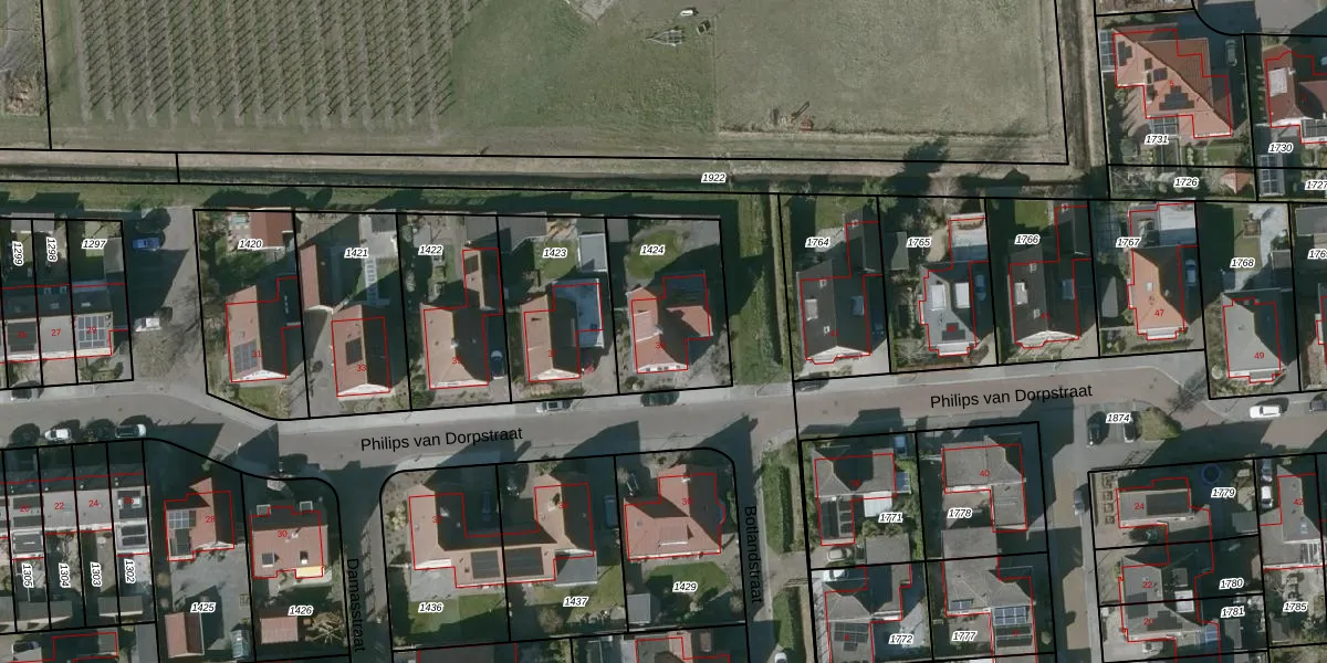 Het perceel waarop Philips van Dorpstraat 39 staat heeft een oppervlakte van 445 m². Dit is een groot perceel. De perceeloppervlakte wordt geregistreerd door het Kadaster. Gedetailleerde informatie over de maten van dit perceel kunt u vinden in het rapport Kadastrale kaart met maatvoering van Philips van Dorpstraat 39.
