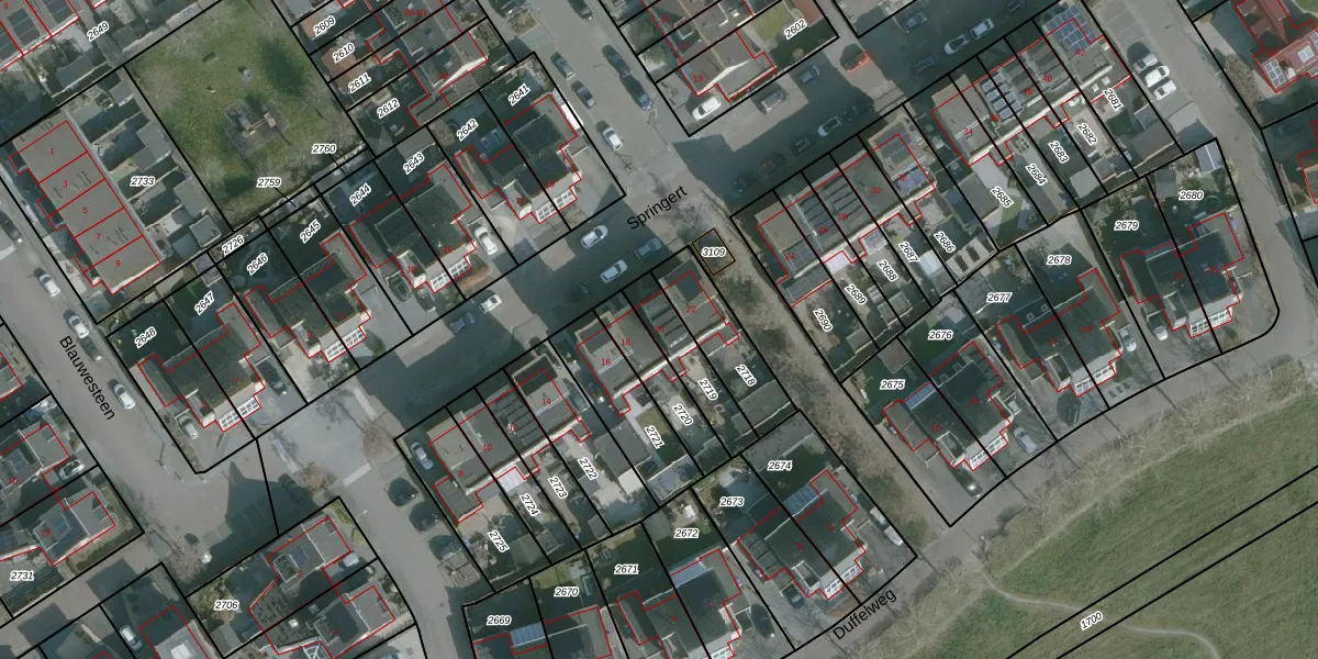 Het perceel waarop Springert 20 staat heeft een oppervlakte van 157 m². Dit is een middelgroot perceel. De perceeloppervlakte wordt geregistreerd door het Kadaster. Gedetailleerde informatie over de maten van dit perceel kunt u vinden in het rapport Kadastrale kaart met maatvoering van Springert 20.