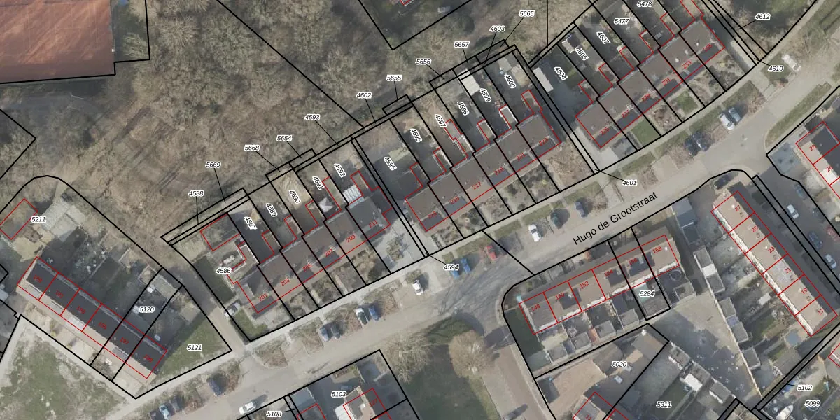 Het perceel waarop Hugo de Grootstraat 213 staat heeft een oppervlakte van 310 m². Dit is een groot perceel. De perceeloppervlakte wordt geregistreerd door het Kadaster. Gedetailleerde informatie over de maten van dit perceel kunt u vinden in het rapport Kadastrale kaart met maatvoering van Hugo de Grootstraat 213.