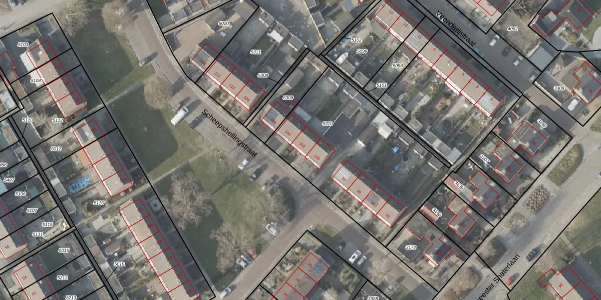 Het perceel waarop Scheepshellingstraat 102 staat heeft een oppervlakte van 2882 m². Dit is een zeer groot perceel. De perceeloppervlakte wordt geregistreerd door het Kadaster. Gedetailleerde informatie over de maten van dit perceel kunt u vinden in het rapport Kadastrale kaart met maatvoering van Scheepshellingstraat 102.