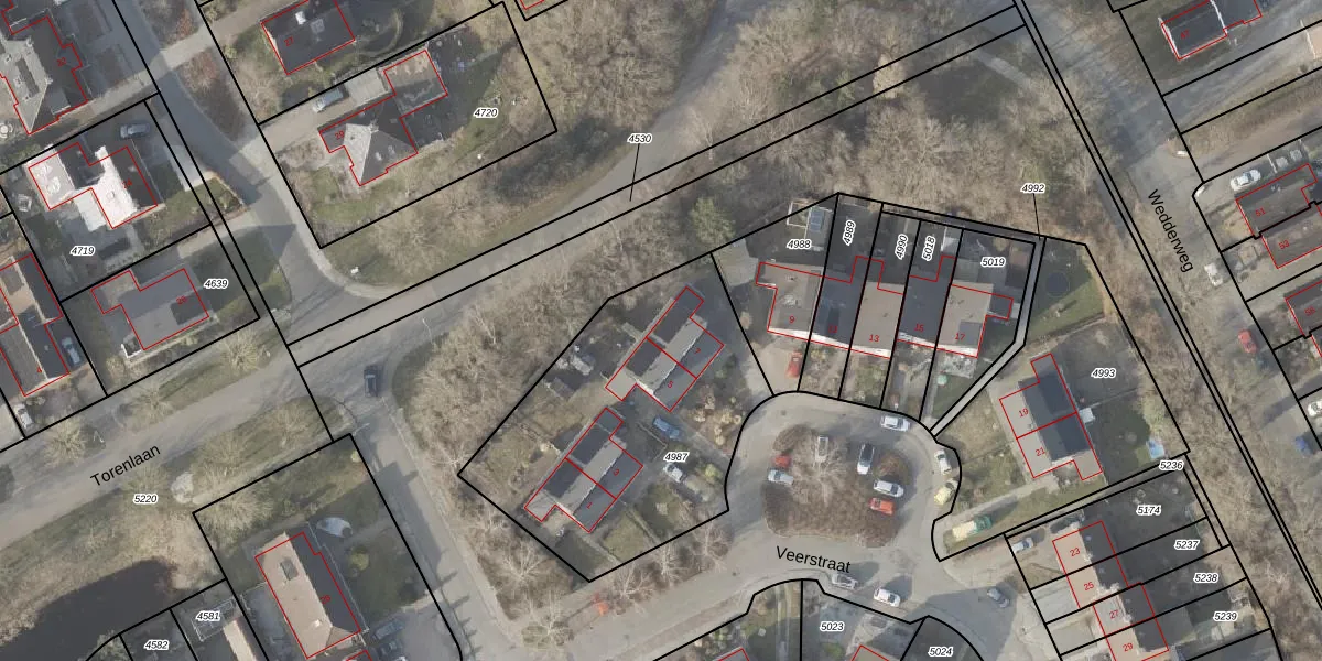 Veerstraat 7 is gelegen op kadastraal perceel PKL02C4987. Deze kadastrale aanduiding is uniek en wordt gebruikt door het Kadaster om eigendomsrechten en andere zakelijke rechten vast te leggen. Het perceel maakt onderdeel uit van de kadastrale gemeente Oude Pekela.