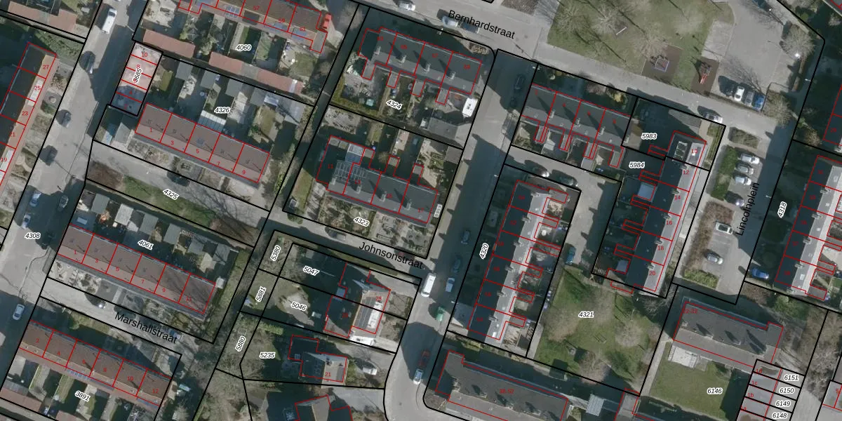 Het perceel waarop Johnsonstraat 17 staat heeft een oppervlakte van 954 m². Dit is een groot perceel. De perceeloppervlakte wordt geregistreerd door het Kadaster. Gedetailleerde informatie over de maten van dit perceel kunt u vinden in het rapport Kadastrale kaart met maatvoering van Johnsonstraat 17.