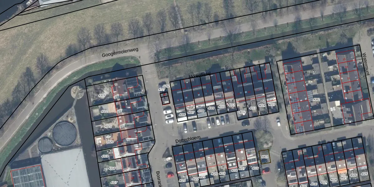 Het perceel waarop het adres ligt is AKM01-B-4007. De afkorting 'AKM01' staat voor kadastrale gemeente Alkemade. Het perceel is kleiner dan gemiddeld in Alkemade. Het perceel is 119 m² groot, terwijl het gemiddelde ligt op 2900,8 m². Het grootste perceel in de kadastrale gemeente is 46,1 ha. Het kleinste perceel heeft een oppervlakte van 0 m². Er zijn geen andere adressen aanwezig op het perceel. In de Basisregistratie Kadaster (BRK) werden de grenzen van het perceel geregistreerd op 18-12-2007.