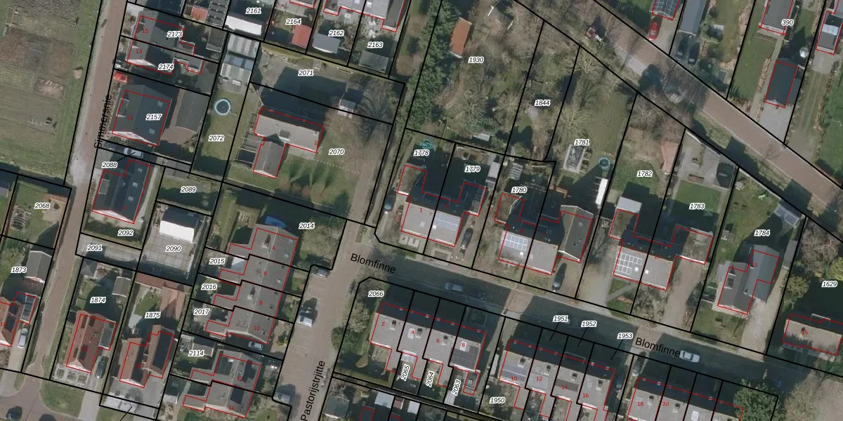 Het perceel waarop Blomfinne 1 staat heeft een oppervlakte van 340 m². Dit is een groot perceel. De perceeloppervlakte wordt geregistreerd door het Kadaster. Gedetailleerde informatie over de maten van dit perceel kunt u vinden in het rapport Kadastrale kaart met maatvoering van Blomfinne 1.