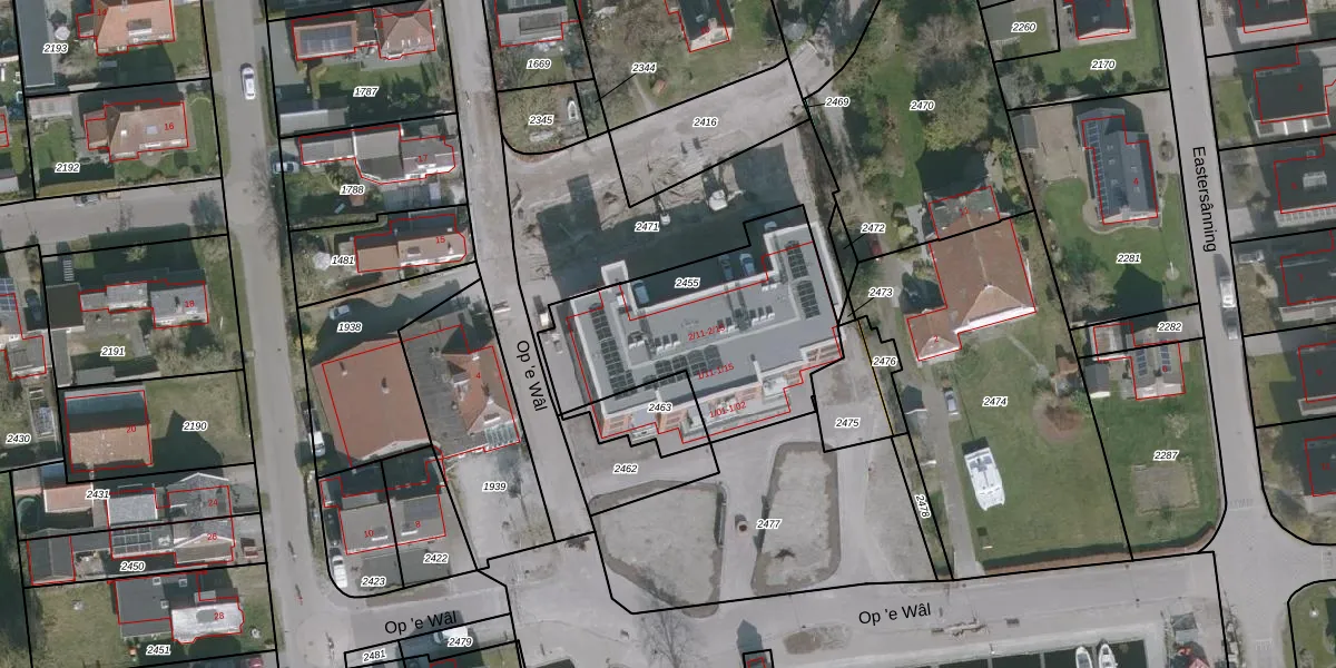 Op 'e Wâl 1-22 is gelegen op kadastraal perceel ODG00A2455. Deze kadastrale aanduiding is uniek en wordt gebruikt door het Kadaster om eigendomsrechten en andere zakelijke rechten vast te leggen. Het perceel maakt onderdeel uit van de kadastrale gemeente Oudega.