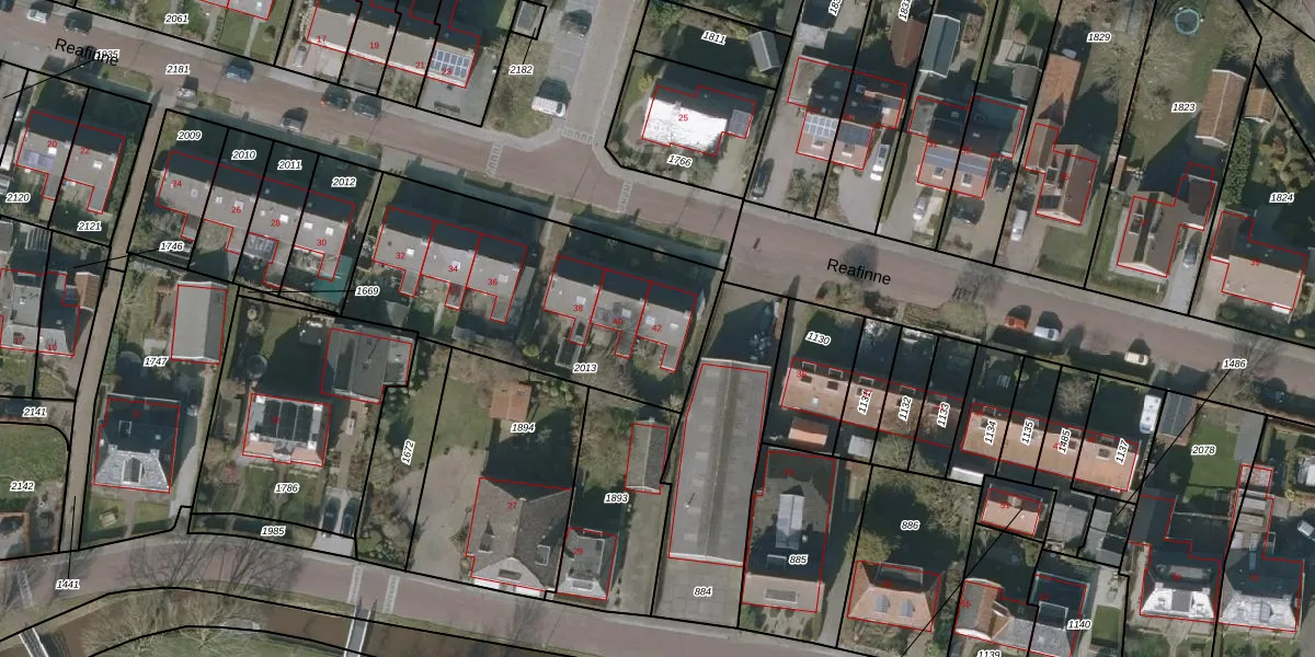 Het perceel waarop Reafinne 42 staat heeft een oppervlakte van 1230 m². Dit is een zeer groot perceel. De perceeloppervlakte wordt geregistreerd door het Kadaster. Gedetailleerde informatie over de maten van dit perceel kunt u vinden in het rapport Kadastrale kaart met maatvoering van Reafinne 42.