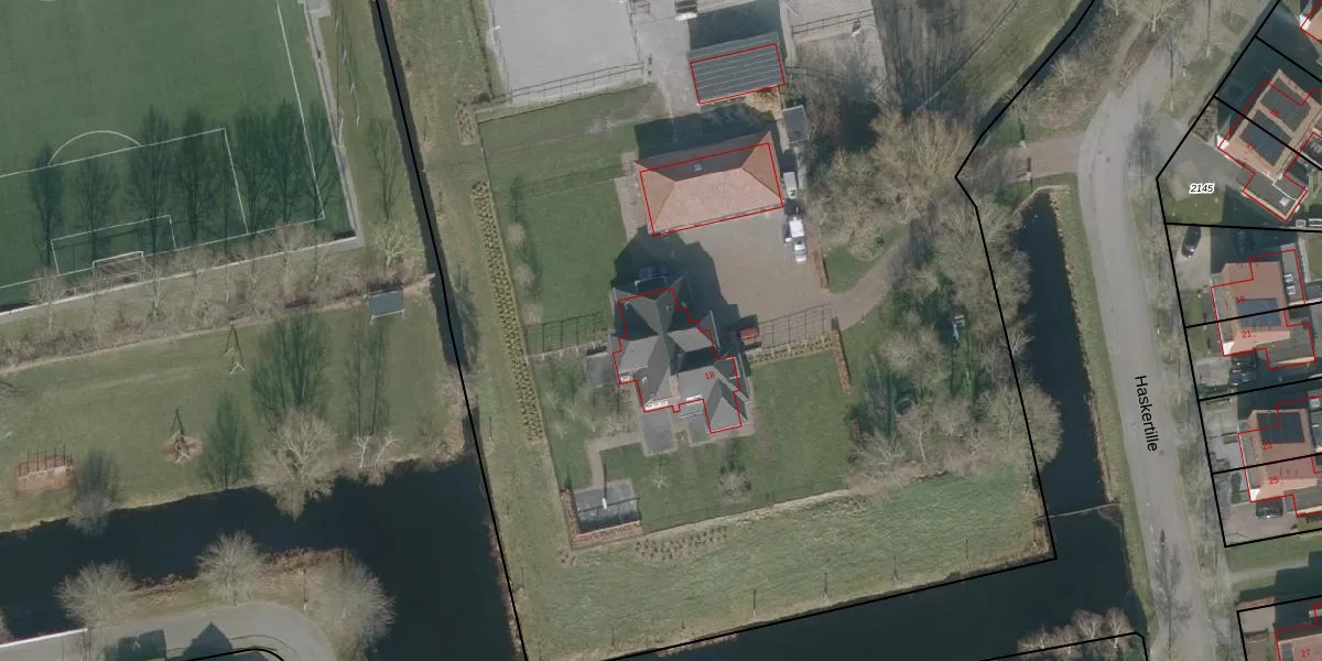 Het perceel waarop Haskertille 18 staat heeft een oppervlakte van 1,5 ha. Dit is een zeer groot perceel. De perceeloppervlakte wordt geregistreerd door het Kadaster. Gedetailleerde informatie over de maten van dit perceel kunt u vinden in het rapport Kadastrale kaart met maatvoering van Haskertille 18.