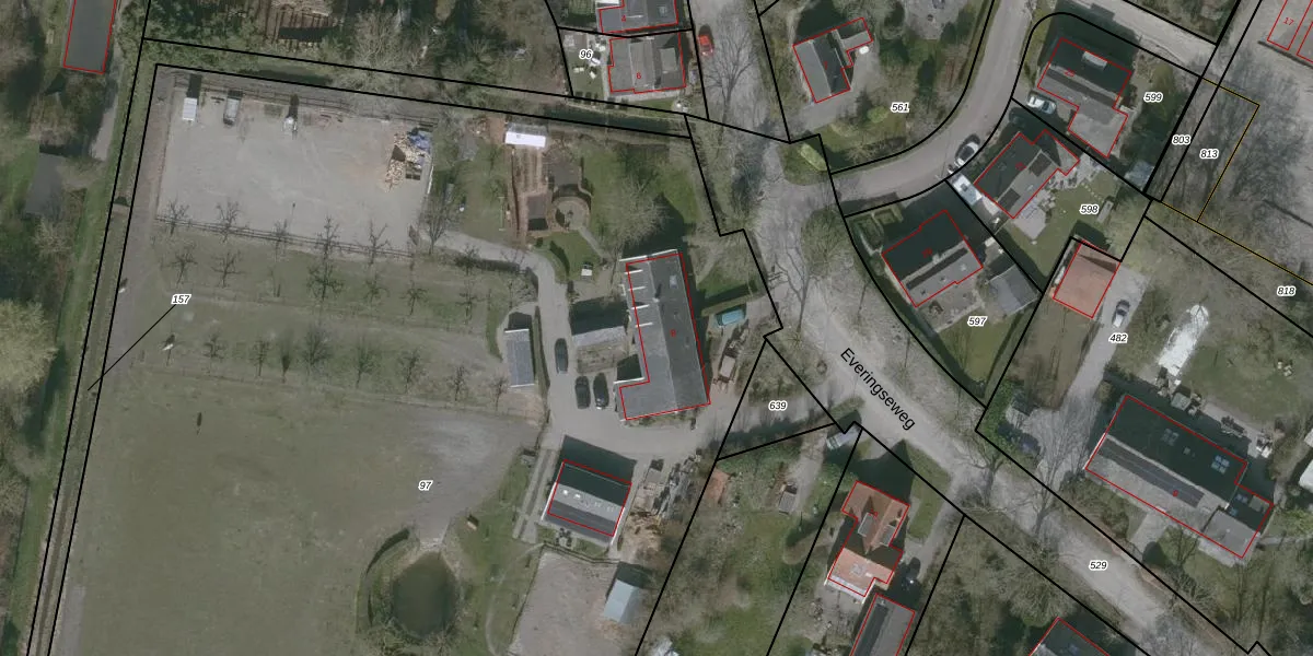 Het perceel waarop Everingseweg 8 staat heeft een oppervlakte van 1,1 ha. Dit is een zeer groot perceel. De perceeloppervlakte wordt geregistreerd door het Kadaster. Gedetailleerde informatie over de maten van dit perceel kunt u vinden in het rapport Kadastrale kaart met maatvoering van Everingseweg 8.