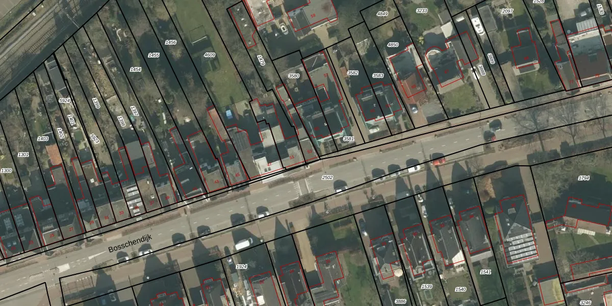 Het perceel waarop Bosschendijk 53 staat heeft een oppervlakte van 278 m². Dit is een middelgroot perceel. De perceeloppervlakte wordt geregistreerd door het Kadaster. Gedetailleerde informatie over de maten van dit perceel kunt u vinden in het rapport Kadastrale kaart met maatvoering van Bosschendijk 53.
