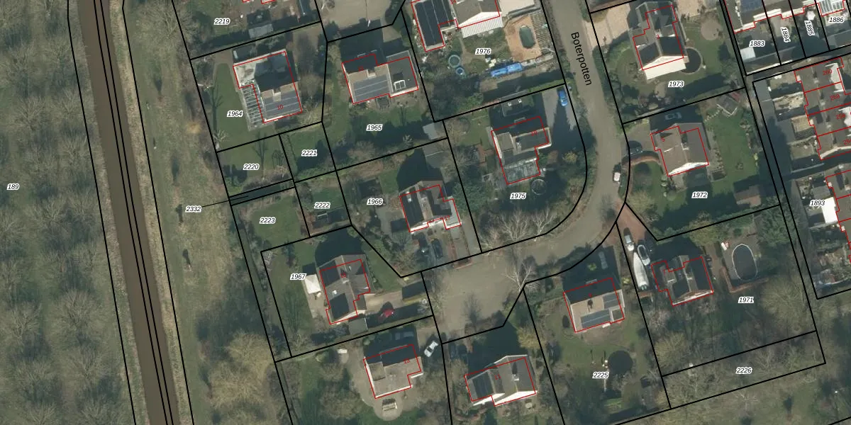 Het perceel waarop Boterpotten 17 staat heeft een oppervlakte van 720 m². Dit is een groot perceel. De perceeloppervlakte wordt geregistreerd door het Kadaster. Gedetailleerde informatie over de maten van dit perceel kunt u vinden in het rapport Kadastrale kaart met maatvoering van Boterpotten 17.