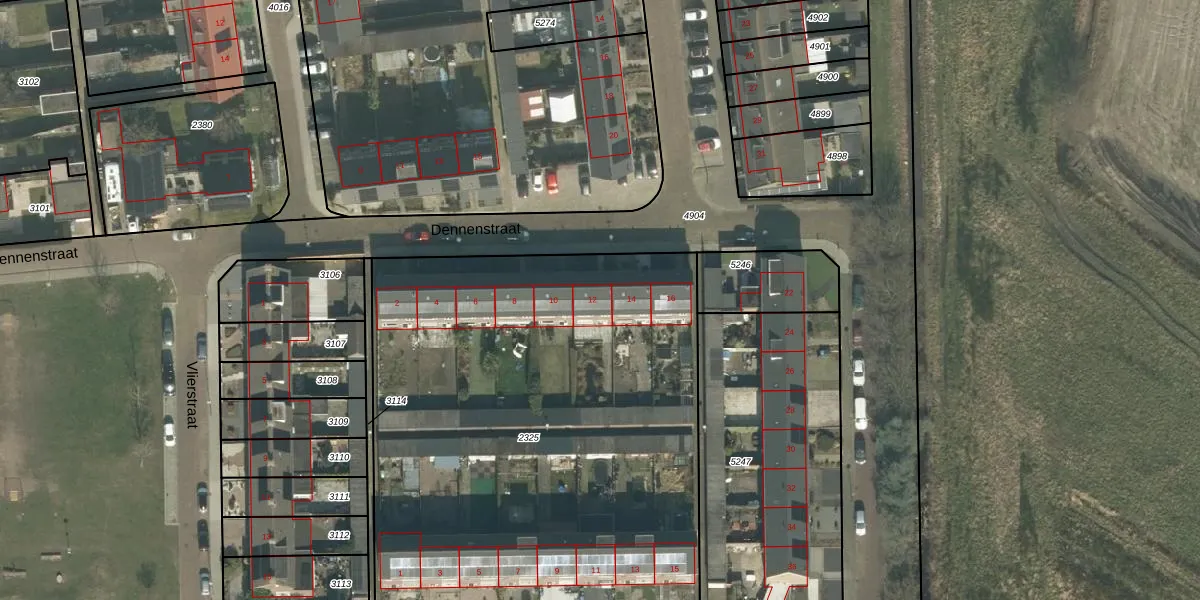 Het perceel waarop Dennenstraat 12 staat heeft een oppervlakte van 3229 m². Dit is een zeer groot perceel. De perceeloppervlakte wordt geregistreerd door het Kadaster. Gedetailleerde informatie over de maten van dit perceel kunt u vinden in het rapport Kadastrale kaart met maatvoering van Dennenstraat 12.
