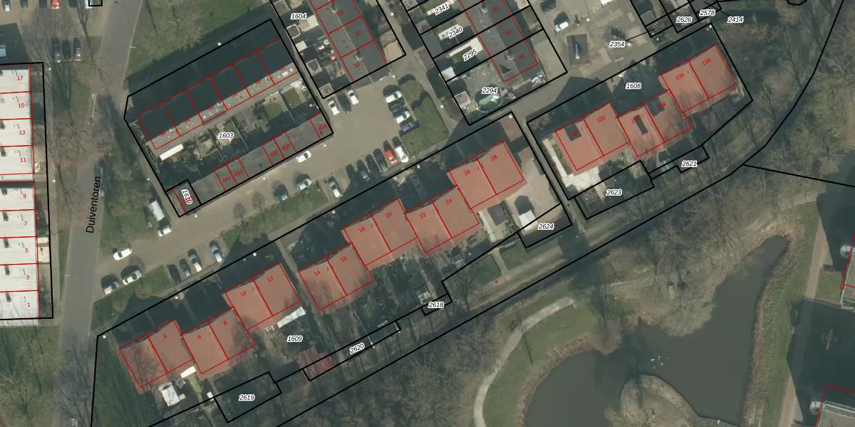 Het perceel waarop Duiventoren 22 staat heeft een oppervlakte van 3182 m². Dit is een zeer groot perceel. De perceeloppervlakte wordt geregistreerd door het Kadaster. Gedetailleerde informatie over de maten van dit perceel kunt u vinden in het rapport Kadastrale kaart met maatvoering van Duiventoren 22.